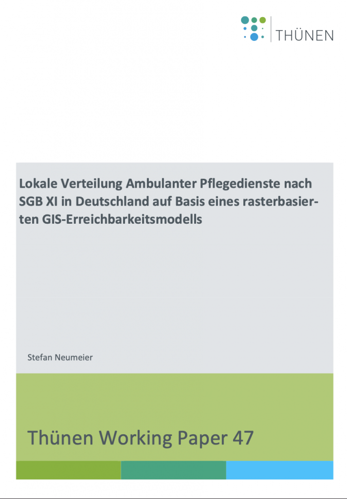 Das Workring Paper des Thünen Instituts untersucht die Erreichbarkeit von ambulanten Pflegediensten in Deutschland, die nach dem Sozialgesetzbuch Elftes Buch (SGB XI) Leistungen anbieten, um den regionalen Versorgungsgrad und die Qualität der Infrastruktur zu bewerten. Diese Erkenntnisse sind essentiell für die regionale Entwicklung und die Diskussion über die Sicherung der Daseinsvorsorge.